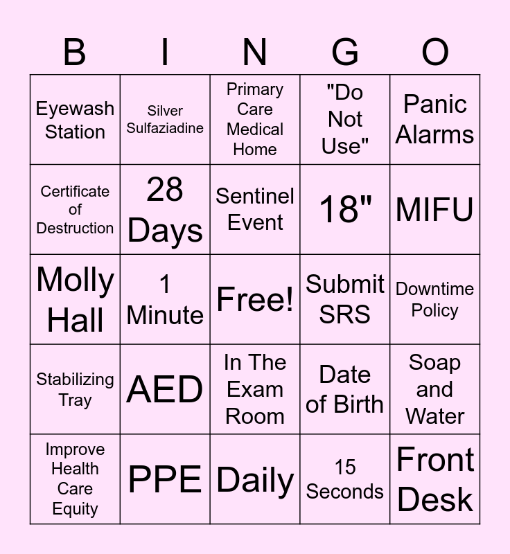 This bingo card has a free space and 24 words: AED, PPE, Sentinel Event, Improve Health Care Equity, Panic Alarms, Eyewash Station, Certificate of Destruction, Silver Sulfaziadine, Submit SRS, In The Exam Room, 18", Molly Hall, Date of Birth, Soap and Water, 28 Days, 15 Seconds, Downtime Policy, Primary Care Medical Home, MIFU, 1 Minute, Front Desk, Stabilizing Tray, "Do Not Use" and Daily.