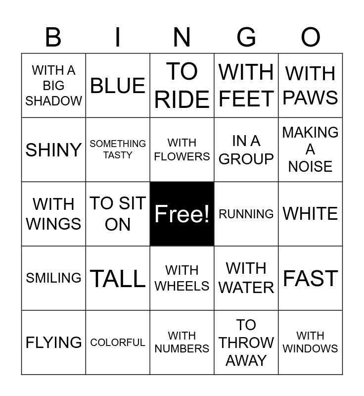 This bingo card has a free space and 24 words: TALL, COLORFUL, WITH FLOWERS, FLYING, WITH PAWS, WITH A BIG SHADOW, SHINY, BLUE, RUNNING, WITH WHEELS, IN A GROUP, WITH WINGS, WITH WATER, FAST, SOMETHING TASTY, TO THROW AWAY, WHITE, TO RIDE, MAKING A NOISE, TO SIT ON, WITH WINDOWS, SMILING, WITH FEET and WITH NUMBERS.