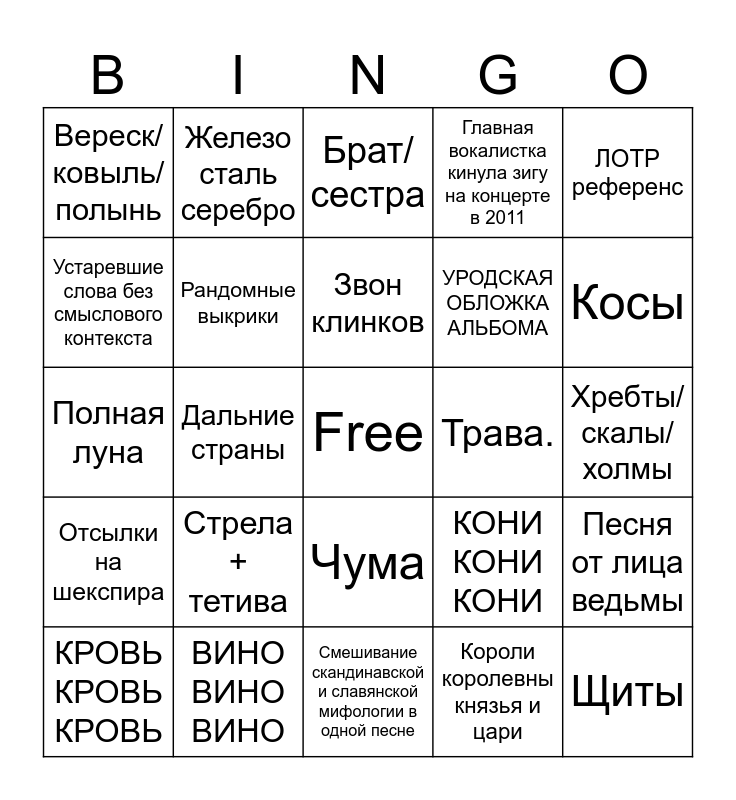 This bingo card has a free space and 24 words: Стрела + тетива, ВИНО ВИНО ВИНО, Звон клинков, КРОВЬ КРОВЬ КРОВЬ, ЛОТР референс, Вереск/ковыль/полынь, Устаревшие слова без смыслового контекста, Железо сталь серебро, Трава., Чума, УРОДСКАЯ ОБЛОЖКА АЛЬБОМА, Полная луна, КОНИ КОНИ КОНИ, Песня от лица ведьмы, Рандомные выкрики, Короли королевны князья и цари, Хребты/скалы/холмы, Брат/сестра, Косы, Дальние страны, Щиты, Отсылки на шекспира, Главная вокалистка кинула зигу на концерте в 2011 and Смешивание скандинавской и славянской мифологии в одной песне.