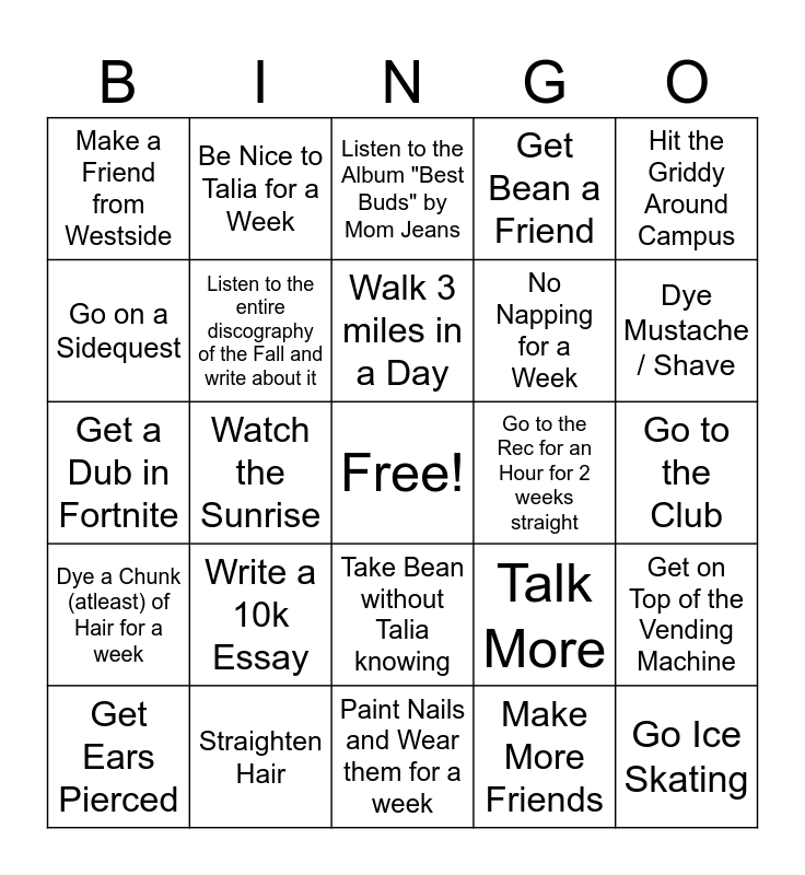 This bingo card has a free space and 24 words: Write a 10k Essay, Straighten Hair, Walk 3 miles in a Day, Get Ears Pierced, Hit the Griddy Around Campus, Make a Friend from Westside, Go on a Sidequest, Be Nice to Talia for a Week, Go to the Rec for an Hour for 2 weeks straight, Take Bean without Talia knowing, No Napping for a Week, Get a Dub in Fortnite, Talk More, Get on Top of the Vending Machine, Listen to the entire discography of the Fall and write about it, Make More Friends, Go to the Club, Listen to the Album "Best Buds" by Mom Jeans, Dye Mustache / Shave, Watch the Sunrise, Go Ice Skating, Dye a Chunk (atleast) of Hair for a week, Get Bean a Friend and Paint Nails and Wear them for a week.