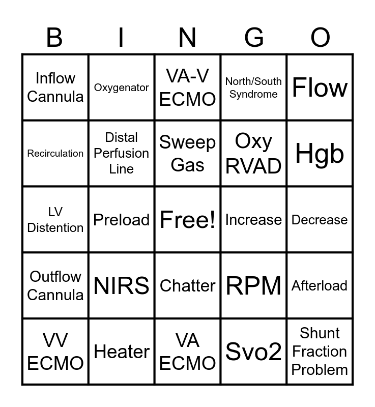 This bingo card has a free space and 24 words: NIRS, Heater, Sweep Gas, VV ECMO, Flow, Inflow Cannula, Recirculation, Oxygenator, Increase, Chatter, Oxy RVAD, LV Distention, RPM, Afterload, Distal Perfusion Line, Svo2, Decrease, VA-V ECMO, Hgb, Preload, Shunt Fraction Problem, Outflow Cannula, North/South Syndrome and VA ECMO.