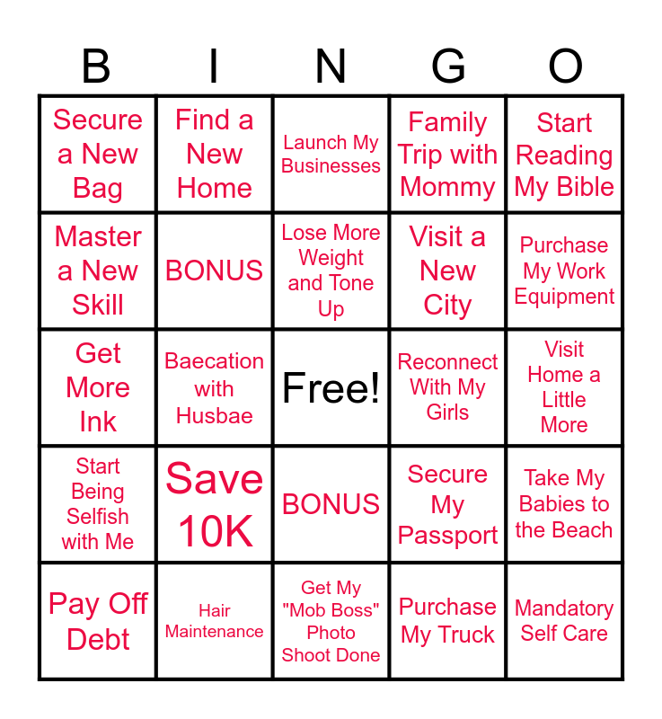 This bingo card has a free space and 24 words: Save 10K, Hair Maintenance, Lose More Weight and Tone Up, Pay Off Debt, Start Reading My Bible, Secure a New Bag, Master a New Skill, Find a New Home, Reconnect With My Girls, BONUS, Visit a New City, Get More Ink, Secure My Passport, Take My Babies to the Beach, BONUS, Purchase My Truck, Visit Home a Little More, Launch My Businesses, Purchase My Work Equipment, Baecation with Husbae, Mandatory Self Care, Start Being Selfish with Me, Family Trip with Mommy and Get My "Mob Boss" Photo Shoot Done.