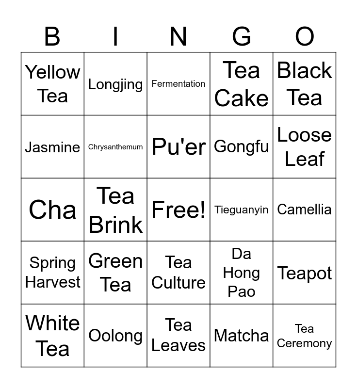 This bingo card has a free space and 24 words: Green Tea, Oolong, Pu'er, White Tea, Black Tea, Yellow Tea, Jasmine, Longjing, Tieguanyin, Tea Culture, Gongfu, Cha, Da Hong Pao, Teapot, Chrysanthemum, Matcha, Camellia, Fermentation, Loose Leaf, Tea Brink, Tea Ceremony, Spring Harvest, Tea Cake and Tea Leaves.