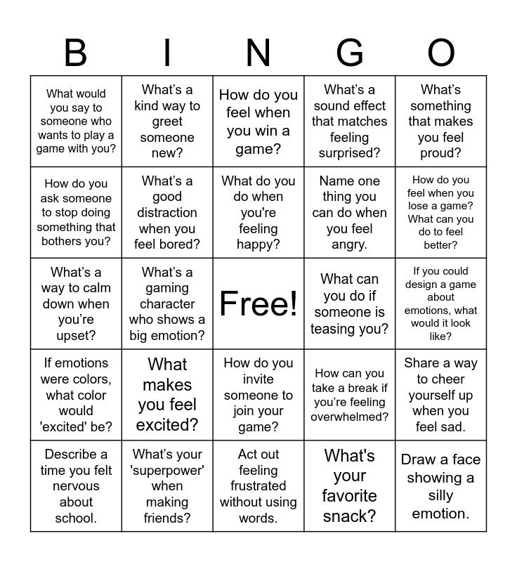 This bingo card has a free space and 25 words: What makes you feel excited?, Act out feeling frustrated without using words., What do you do when you're feeling happy?, Describe a time you felt nervous about school., What’s something that makes you feel proud?, What would you say to someone who wants to play a game with you?, How do you ask someone to stop doing something that bothers you?, What’s a kind way to greet someone new?, What can you do if someone is teasing you?, How do you invite someone to join your game?, Name one thing you can do when you feel angry., What’s a way to calm down when you’re upset?, How can you take a break if you’re feeling overwhelmed?, Share a way to cheer yourself up when you feel sad., What’s a good distraction when you feel bored?, What’s your favorite video game, and why?, If you could design a game about emotions, what would it look like?, How do you feel when you win a game?, How do you feel when you lose a game? What can you do to feel better?, What’s a gaming character who shows a big emotion?, Draw a face showing a silly emotion., What’s your 'superpower' when making friends?, If emotions were colors, what color would 'excited' be?, What’s a sound effect that matches feeling surprised? and What's your favorite snack?.
