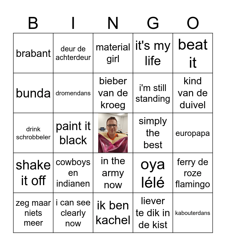 This bingo card has a free space and 24 words: cowboys en indianen, i can see clearly now, bieber van de kroeg, zeg maar niets meer, beat it, brabant, bunda, deur de achterdeur, simply the best, in the army now, i'm still standing, drink schrobbeler, oya lélé, ferry de roze flamingo, dromendans, liever te dik in de kist, europapa, material girl, kind van de duivel, paint it black, kabouterdans, shake it off, it's my life and ik ben kachel.