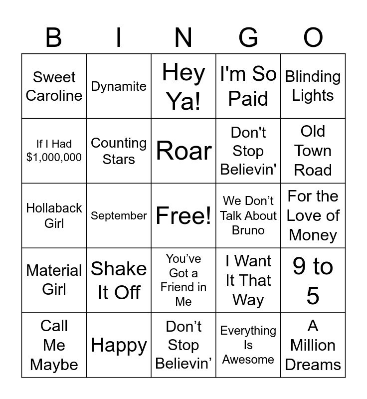 This bingo card has a free space and 24 words: Shake It Off, Happy, Roar, Call Me Maybe, Blinding Lights, Sweet Caroline, If I Had $1,000,000, Dynamite, We Don’t Talk About Bruno, You’ve Got a Friend in Me, Don't Stop Believin', Hollaback Girl, I Want It That Way, 9 to 5, Counting Stars, Everything Is Awesome, For the Love of Money, Hey Ya!, Old Town Road, September, A Million Dreams, Material Girl, I'm So Paid and Don’t Stop Believin’.