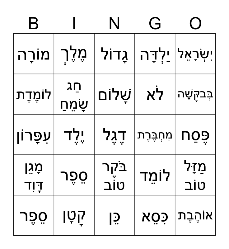 This bingo card has 39 words: בְּרָכָה, בֵּית כְּנֶסֶת, מִצְוָה, חַג שָׂמֵחַ, סֵפֶר, בֹּקֶר טוֹב, שָׁלוֹם, תּוֹדָה, יִשְׂרָאֵל, מָגֵן דָּוִד, יֶלֶד, יַלְדָּה, דֶגֶל, פֶּסַח, מַחְבֶּרֶת, סֵפֶר, כֶּלֶב, מוֹרָה, מוֹרֶה, לוֹמֵד, לוֹמֶדֶת, כֵּן, לֹא, בְּבַקָּשָׁה, סְלִיחָה, אוֹהֵב, אוֹהֶבֶת, עִם, ...וְ, מֶלֶךְ, אֵיפֹה, בֵּית סֵפֶר, גָדוֹל, קָטָן, כִּסֵא, לוּחַ, מַזָּל טוֹב, עִפָּרוֹן and שֻׁלְחָן.