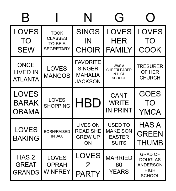 This bingo card has a free space and 24 words: BORN/RAISED IN JAX, LOVES OPRAH WINFREY, FAVORITE SINGER MAHALIA JACKSON, HAS 2 GREAT GRANDS, LOVES TO COOK, LOVES TO SEW, ONCE LIVED IN ATLANTA, TOOK CLASSES TO BE A SECRETARY, CANT WRITE IN PRINT, LIVES ON ROAD SHE GREW UP ON, WAS A CHEERLEADER IN HIGH SCHOOL, LOVES BARAK OBAMA, USED TO MAKE SON EASTER SUITS, HAS A GREEN THUMB, LOVES MANGOS, MARRIED 60 YEARS, GOES TO YMCA, SINGS IN CHOIR, TRESURER OF HER CHURCH, LOVES SHOPPING, GRAD OF DOUGLAS ANDERSON HIGH SCHOOL, LOVES BAKING, LOVES HER FAMILY and LOVES 2 PARTY.