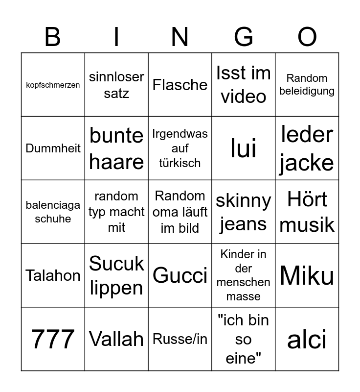This bingo card has a free space and 24 words: Sucuk lippen, Vallah, Irgendwas auf türkisch, 777, Random beleidigung, kopfschmerzen, Dummheit, sinnloser satz, skinny jeans, Gucci, lui, balenciaga schuhe, Kinder in der menschen masse, Miku, bunte haare, "ich bin so eine", Hört musik, Flasche, leder jacke, random typ macht mit, alci, Talahon, Isst im video and Russe/in.