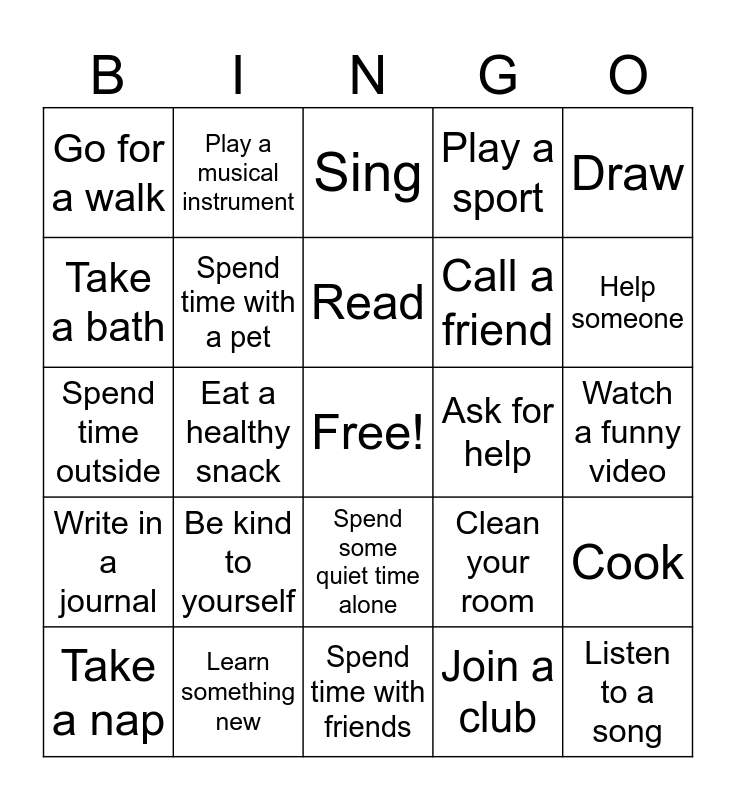This bingo card has a free space and 29 words: Take a nap, Do some stretches, Eat a healthy snack, Yoga, Go for a walk, Sing, Spend time with a pet, Be kind to yourself, Ask for help, Learn something new, Watch a funny video, Listen to a song, Spend time with friends, Join a club, Help someone, Medidate, Spend some quiet time alone, Write in a journal, Draw, Spend time outside, Clean your room, Do a craft, Call a friend, Take a bath, Play a sport, Play a musical instrument, Cook, Read and Doodle.