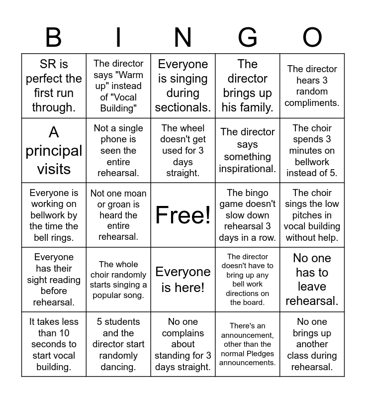 This bingo card has a free space and 33 words: The director doesn't have to talk about pulsing the beat during SR., The director says "class" instead of "rehearsal"., Not one moan or groan is heard the entire rehearsal., The choir sings the high pitches in vocal building without help., Everyone has their sight reading before rehearsal., Not a single phone is seen the entire rehearsal., The director hears 3 random compliments., It takes less than 10 seconds to start vocal building., The director says "Warm up" instead of "Vocal Building", Someone had to remind the director to take roll., The wheel doesn't get used for 3 days straight., Everyone is singing during sectionals., Everyone starts vocal building with a smile 3 days in a row., Someone sneezes and the entire choir says "bless you"., The bingo game doesn't slow down rehearsal 3 days in a row., The choir spends 3 minutes on bellwork instead of 5., 5 students and the director start randomly dancing., Everyone is working on bellwork by the time the bell rings., The whole choir randomly starts singing a popular song., The director doesn't have to bring up any bell work directions on the board., Everyone is here!, The director doesn't have to give instructions on how to direct during vocal building., SR is perfect the first run through., The choir sings the low pitches in vocal building without help., No one complains about standing for 3 days straight., No one brings up another class during rehearsal., The director brings up his family., The director says something inspirational., A principal visits, No one has to leave rehearsal., The director didn't bring up posture that rehearsal., There's an announcement, other than the normal Pledges announcements. and Everyone has a pencil..