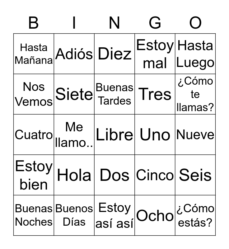 This bingo card has a free space and 24 words: Hola, Buenos Días, Buenas Tardes, Buenas Noches, Hasta Luego, Hasta Mañana, Nos Vemos, Adiós, Uno, Dos, Tres, Cuatro, Cinco, Seis, Siete, Ocho, Nueve, Diez, ¿Cómo te llamas?, Me llamo.., ¿Cómo estás?, Estoy bien, Estoy mal and Estoy así así.
