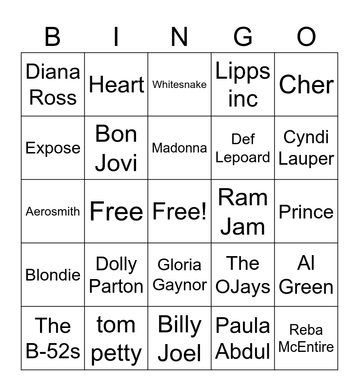 This bingo card has a free space and 34 words: Micheal Jackson, Paula Abdul, Janet Jackson, Tina turner, Blondie, Bon Jovi, Cher, The B-52s, Heart, The Romantics, Madonna, Whitesnake, Queen, Pat Bentar, Ram Jam, Cyndi Lauper, tom petty, Aerosmith, Dolly Parton, The OJays, Gloria Gaynor, Stevie Nicks, Diana Ross, Prince, Billy Joel, Reba McEntire, Lipps inc, Marvin Gaye, Def Lepoard, Expose, The police, Free, Al Green and Elton John.
