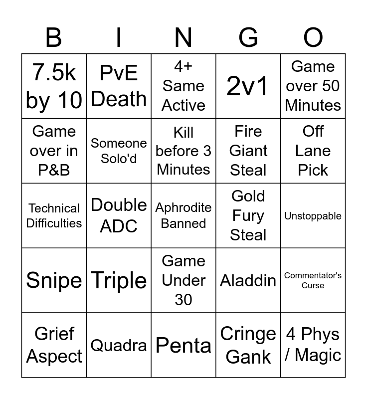 This bingo card has a free space and 24 words: Triple, Quadra, Kill before 3 Minutes, Grief Aspect, Game over 50 Minutes, 7.5k by 10, Game over in P&B, PvE Death, Gold Fury Steal, Game Under 30, Fire Giant Steal, Technical Difficulties, Aladdin, Commentator's Curse, Someone Solo'd, Cringe Gank, Unstoppable, 4+ Same Active, Off Lane Pick, Double ADC, 4 Phys / Magic, Snipe, 2v1 and Penta.