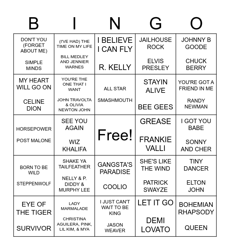 This bingo card has a free space and 29 words: EYE OF THE TIGER SURVIVOR, HAPPY PHARRELL WILLIAMS, SEE YOU AGAIN WIZ KHALIFA, FOOTLOOSE KENNY LOGGINS, DON'T YOU (FORGET ABOUT ME) SIMPLE MINDS, I BELIEVE I CAN FLY R. KELLY, YOU'RE THE ONE THAT I WANT JOHN TRAVOLTA & OLIVIA NEWTON JOHN, SHAKE YA TAILFEATHER NELLY & P. DIDDY & MURPHY LEE, GREASE FRANKIE VALLI, LADY MARMALADE CHRISTINA AGUILERA, PINK, LIL KIM, & MYA, I GOT YOU BABE SONNY AND CHER, BOHEMIAN RHAPSODY QUEEN, I JUST CAN'T WAIT TO BE KING JASON WEAVER, LET IT GO DEMI LOVATO, YOU'RE GOT A FRIEND IN ME RANDY NEWMAN, A WHOLE NEW WORLD PEABO BRYSON & REGINA BELLE, GANGSTA'S PARADISE COOLIO, BORN TO BE WILD STEPPENWOLF, JOHNNY B GOODE CHUCK BERRY, HORSEPOWER POST MALONE, SHE'S LIKE THE WIND PATRICK SWAYZE, OLD TIME ROCK AND ROLL BOB SEGER, STAYIN ALIVE BEE GEES, MY HEART WILL GO ON CELINE DION, JAILHOUSE ROCK ELVIS PRESLEY, (I'VE HAD) THE TIME ON MY LIFE BILL MEDLEY AND JENNIER WARNES, TINY DANCER ELTON JOHN, ALL STAR SMASHMOUTH and ACIDENTLY IN LOVE COUNTING CROWS.