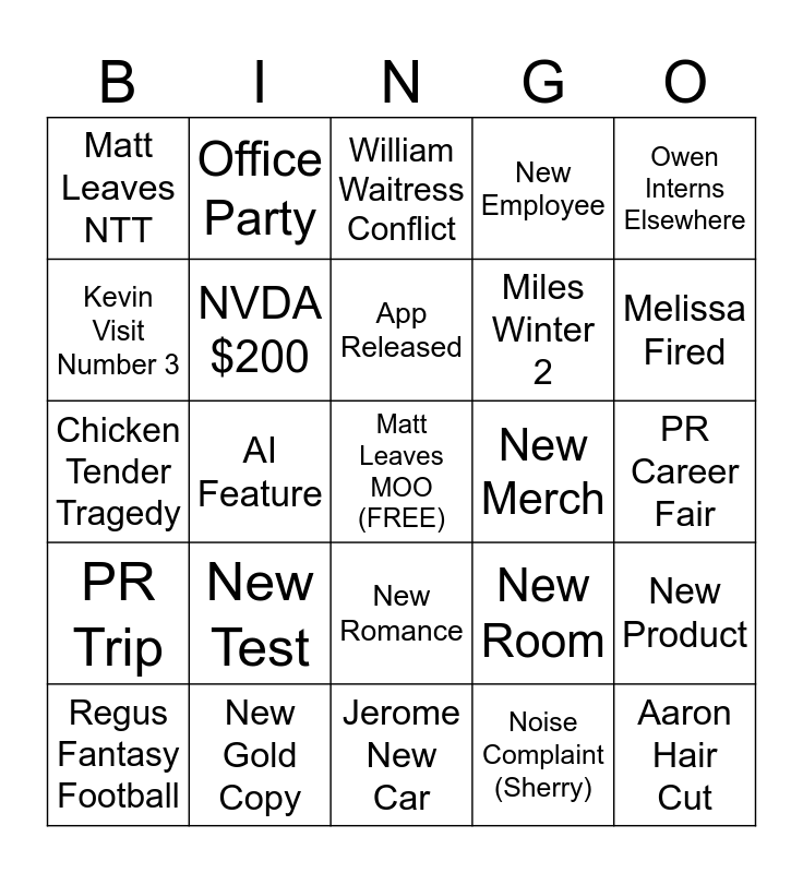 This bingo card has a free space and 24 words: New Test, New Gold Copy, App Released, Regus Fantasy Football, Owen Interns Elsewhere, Matt Leaves NTT, Kevin Visit Number 3, Office Party, New Merch, New Romance, Miles Winter 2, Chicken Tender Tragedy, New Room, New Product, NVDA $200, Noise Complaint (Sherry), PR Career Fair, William Waitress Conflict, Melissa Fired, AI Feature, Aaron Hair Cut, PR Trip, New Employee and Jerome New Car.