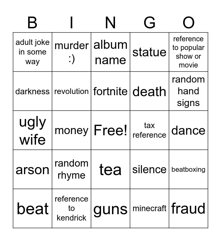 This bingo card has a free space and 24 words: random rhyme, reference to kendrick, fortnite, beat, reference to popular show or movie, adult joke in some way, darkness, murder :), tax reference, tea, death, ugly wife, silence, beatboxing, revolution, minecraft, dance, album name, random hand signs, money, fraud, arson, statue and guns.