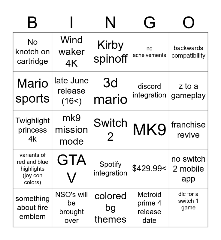 This bingo card has a free space and 24 words: GTA V, NSO's will be brought over, 3d mario, something about fire emblem, backwards compatibility, No knotch on cartridge, Mario sports, Wind waker 4K, MK9, Spotify integration, discord integration, Twighlight princess 4k, $429.99<, no switch 2 mobile app, late June release (16<), Metroid prime 4 release date, franchise revive, Kirby spinoff, z to a gameplay, mk9 mission mode, dlc for a switch 1 game, variants of red and blue highlights (joy con colors), no acheivements and colored bg themes.