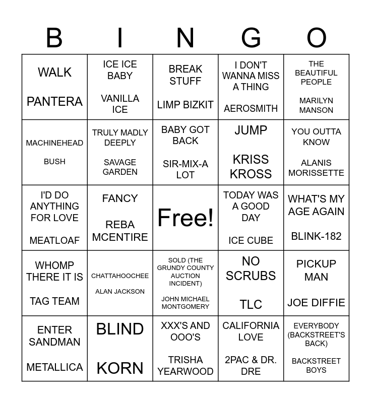 This bingo card has a free space and 29 words: ENTER SANDMAN METALLICA, GENIE IN A BOTTLE CHRISTINA AGUILERA, FANCY REBA MCENTIRE, MAMA SAID KNOCK YOU OUT LL COOL J, WALK PANTERA, BREAK STUFF LIMP BIZKIT, TRULY MADLY DEEPLY SAVAGE GARDEN, CHATTAHOOCHEE ALAN JACKSON, TODAY WAS A GOOD DAY ICE CUBE, BLIND KORN, WHAT'S MY AGE AGAIN BLINK-182, EVERYBODY (BACKSTREET'S BACK) BACKSTREET BOYS, XXX'S AND OOO'S TRISHA YEARWOOD, CALIFORNIA LOVE 2PAC & DR. DRE, YOU OUTTA KNOW ALANIS MORISSETTE, I'LL MAKE LOVE TO YOU BOYZ 2 MEN, SOLD (THE GRUNDY COUNTY AUCTION INCIDENT) JOHN MICHAEL MONTGOMERY, WHOMP THERE IT IS TAG TEAM, THE BEAUTIFUL PEOPLE MARILYN MANSON, I'D DO ANYTHING FOR LOVE MEATLOAF, NO SCRUBS TLC, GOODBYE EARL THE CHICKS, JUMP KRISS KROSS, MACHINEHEAD BUSH, I DON'T WANNA MISS A THING AEROSMITH, ICE ICE BABY VANILLA ICE, PICKUP MAN JOE DIFFIE, BABY GOT BACK SIR-MIX-A LOT and DRAGULA ROB ZOMBIE.