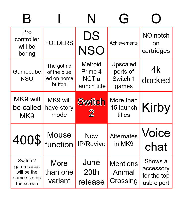 This bingo card has a free space and 24 words: Mouse function, More than one variant, Metroid Prime 4 NOT a launch title, Switch 2 game cases will be the same size as the screen, NO notch on cartridges, Pro controller will be boring, Gamecube NSO, FOLDERS, More than 15 launch titles, New IP/Revive, Upscaled ports of Switch 1 games, MK9 will be called MK9, Alternates in MK9, Voice chat, The got rid of the blue led on home button, Mentions Animal Crossing, Kirby, DS NSO, 4k docked, MK9 will have story mode, Shows a accessory for the top usb c port, 400$, Achievements and June 20th release.