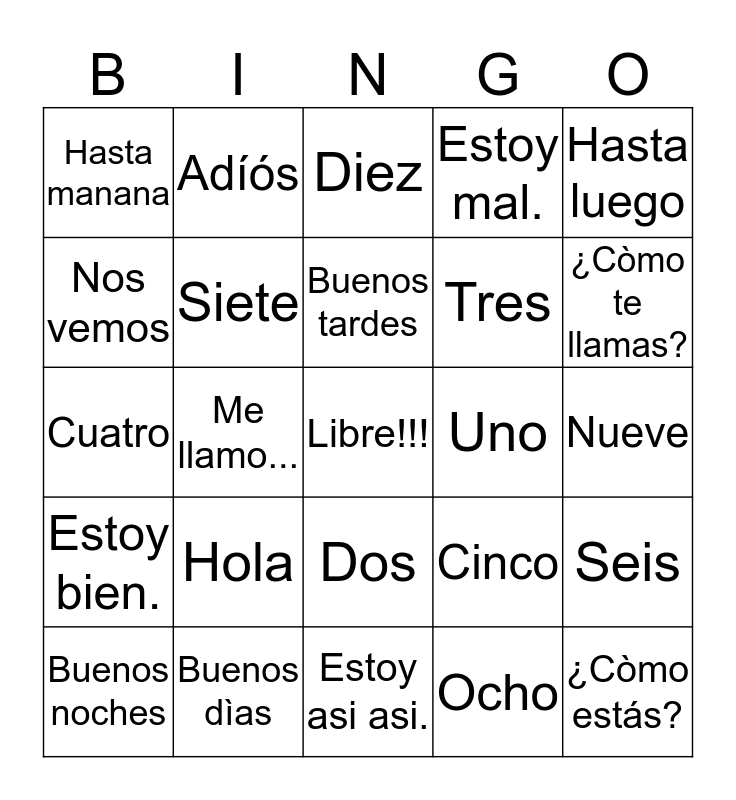 This bingo card has a free space and 24 words: Hola, Buenos dìas, Buenos tardes, Buenos noches, Hasta luego, Hasta manana, Nos vemos, Adíós, Uno, Dos, Tres, Cuatro, Cinco, Seis, Siete, Ocho, Nueve, Diez, ¿Còmo te llamas?, Me llamo..., ¿Còmo estás?, Estoy bien., Estoy mal. and Estoy asi asi..