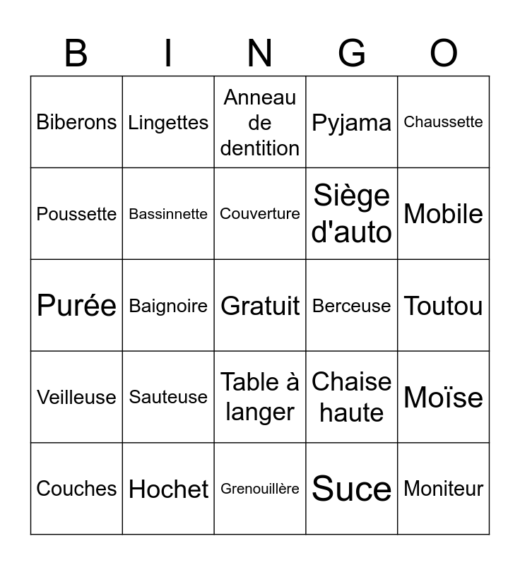 This bingo card has a free space and 24 words: Sauteuse, Hochet, Couverture, Couches, Chaussette, Biberons, Poussette, Lingettes, Berceuse, Table à langer, Siège d'auto, Purée, Chaise haute, Moïse, Bassinnette, Suce, Toutou, Anneau de dentition, Mobile, Baignoire, Moniteur, Veilleuse, Pyjama and Grenouillère.