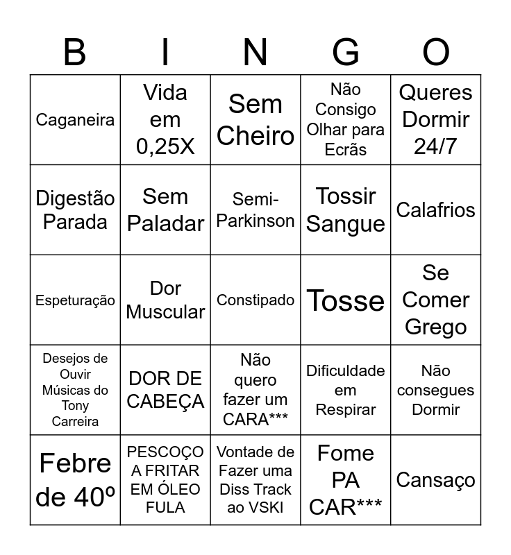 This bingo card has a free space and 24 words: DOR DE CABEÇA, PESCOÇO A FRITAR EM ÓLEO FULA, Semi-Parkinson, Febre de 40º, Queres Dormir 24/7, Caganeira, Digestão Parada, Vida em 0,25X, Tosse, Não quero fazer um CARA***, Tossir Sangue, Espeturação, Dificuldade em Respirar, Não consegues Dormir, Sem Paladar, Fome PA CAR***, Se Comer Grego, Sem Cheiro, Calafrios, Dor Muscular, Cansaço, Desejos de Ouvir Músicas do Tony Carreira, Não Consigo Olhar para Ecrãs and Vontade de Fazer uma Diss Track ao VSKI.