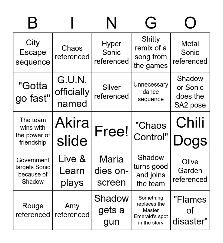 This bingo card has a free space and 24 words: Live & Learn plays, Amy referenced, Silver referenced, Rouge referenced, Metal Sonic referenced, City Escape sequence, "Gotta go fast", Chaos referenced, "Chaos Control", Maria dies on-screen, Unnecessary dance sequence, The team wins with the power of friendship, Shadow turns good and joins the team, Olive Garden referenced, G.U.N. officially named, Something replaces the Master Emerald's spot in the story, Chili Dogs, Hyper Sonic referenced, Shadow or Sonic does the SA2 pose, Akira slide, "Flames of disaster", Government targets Sonic because of Shadow, Shitty remix of a song from the games and Shadow gets a gun.