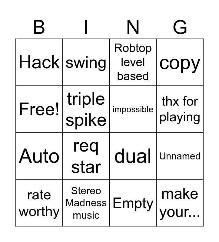 This bingo card has 16 words: Stereo Madness music, Unnamed, Robtop level based, Hack, Auto, swing, dual, Empty, Free!, triple spike, rate worthy, copy, req star, thx for playing, impossible and make your....