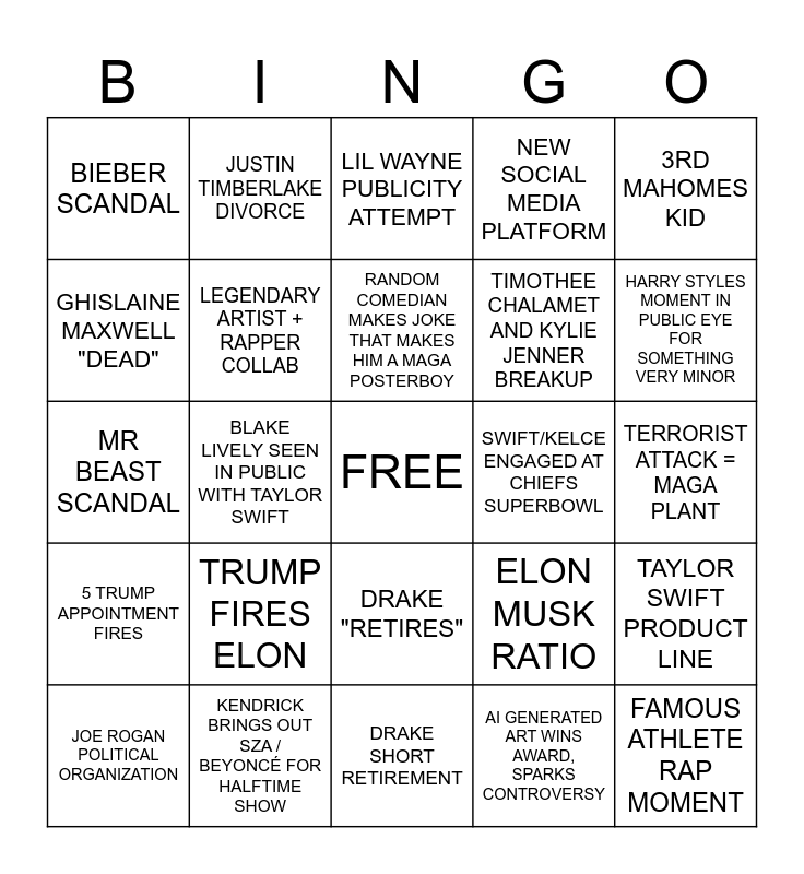This bingo card has a free space and 24 words: TRUMP FIRES ELON, KENDRICK BRINGS OUT SZA / BEYONCÉ FOR HALFTIME SHOW, RANDOM COMEDIAN MAKES JOKE THAT MAKES HIM A MAGA POSTERBOY, JOE ROGAN POLITICAL ORGANIZATION, 3RD MAHOMES KID, BIEBER SCANDAL, GHISLAINE MAXWELL "DEAD", JUSTIN TIMBERLAKE DIVORCE, SWIFT/KELCE ENGAGED AT CHIEFS SUPERBOWL, DRAKE "RETIRES", TIMOTHEE CHALAMET AND KYLIE JENNER BREAKUP, MR BEAST SCANDAL, ELON MUSK RATIO, TAYLOR SWIFT PRODUCT LINE, LEGENDARY ARTIST + RAPPER COLLAB, AI GENERATED ART WINS AWARD, SPARKS CONTROVERSY, TERRORIST ATTACK = MAGA PLANT, LIL WAYNE PUBLICITY ATTEMPT, HARRY STYLES MOMENT IN PUBLIC EYE FOR SOMETHING VERY MINOR, BLAKE LIVELY SEEN IN PUBLIC WITH TAYLOR SWIFT, FAMOUS ATHLETE RAP MOMENT, 5 TRUMP APPOINTMENT FIRES, NEW SOCIAL MEDIA PLATFORM and DRAKE SHORT RETIREMENT.