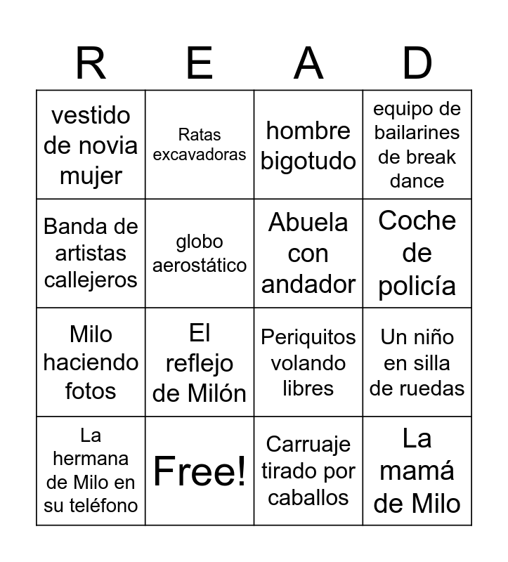 This bingo card has 16 words: Free!, Un niño en silla de ruedas, hombre bigotudo, vestido de novia mujer, Milo haciendo fotos, Ratas excavadoras, Periquitos volando libres, Carruaje tirado por caballos, Banda de artistas callejeros, globo aerostático, La hermana de Milo en su teléfono, equipo de bailarines de break dance, El reflejo de Milón, Coche de policía, Abuela con andador and La mamá de Milo.
