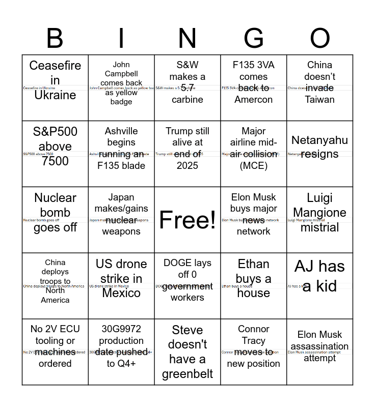 This bingo card has 23 images, a free space and 24 words: US drone strike in Mexico, 30G9972 production date pushed to Q4+, Trump still alive at end of 2025, No 2V ECU tooling or machines ordered, China doesn’t invade Taiwan, Ceasefire in Ukraine, S&P500 above 7500, John Campbell comes back as yellow badge, Elon Musk buys major news network, DOGE lays off 0 government workers, Major airline mid-air collision (MCE), Nuclear bomb goes off, Ethan buys a house, AJ has a kid, Ashville begins running an F135 blade, Connor Tracy moves to new position, Luigi Mangione mistrial, S&W makes a 5.7 carbine, Netanyahu resigns, Japan makes/gains nuclear weapons, Elon Musk assassination attempt, China deploys troops to North America, F135 3VA comes back to Amercon and Steve doesn't have a greenbelt.