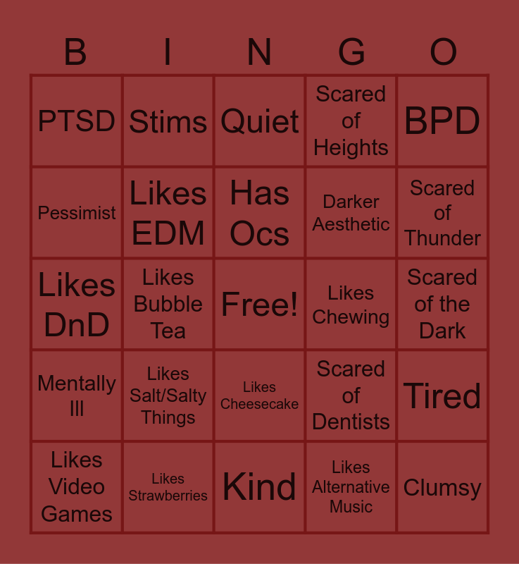 This bingo card has a free space and 24 words: Likes Salt/Salty Things, Likes Strawberries, Has Ocs, Likes Video Games, BPD, PTSD, Pessimist, Stims, Likes Chewing, Likes Cheesecake, Darker Aesthetic, Likes DnD, Scared of Dentists, Tired, Likes EDM, Likes Alternative Music, Scared of the Dark, Quiet, Scared of Thunder, Likes Bubble Tea, Clumsy, Mentally Ill, Scared of Heights and Kind.