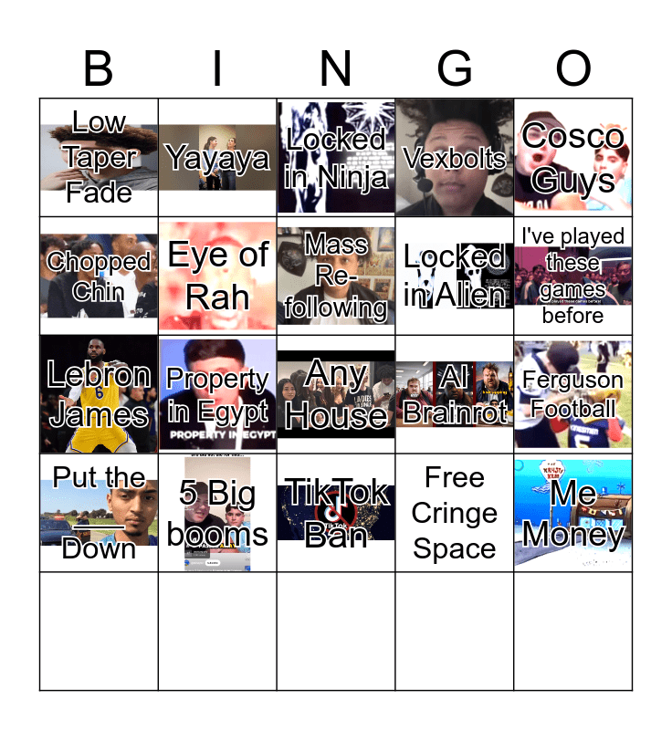 This bingo card has 19 images and 20 words: Property in Egypt, TikTok Ban, Locked in Ninja, 5 Big booms, Any House, Cosco Guys, AI Brainrot, Low Taper Fade, Locked in Alien, Yayaya, I've played these games before, Lebron James, Chopped Chin, Put the ___ Down, Eye of Rah, Me Money, Mass Re-following, Vexbolts, Ferguson Football and Free Cringe Space.