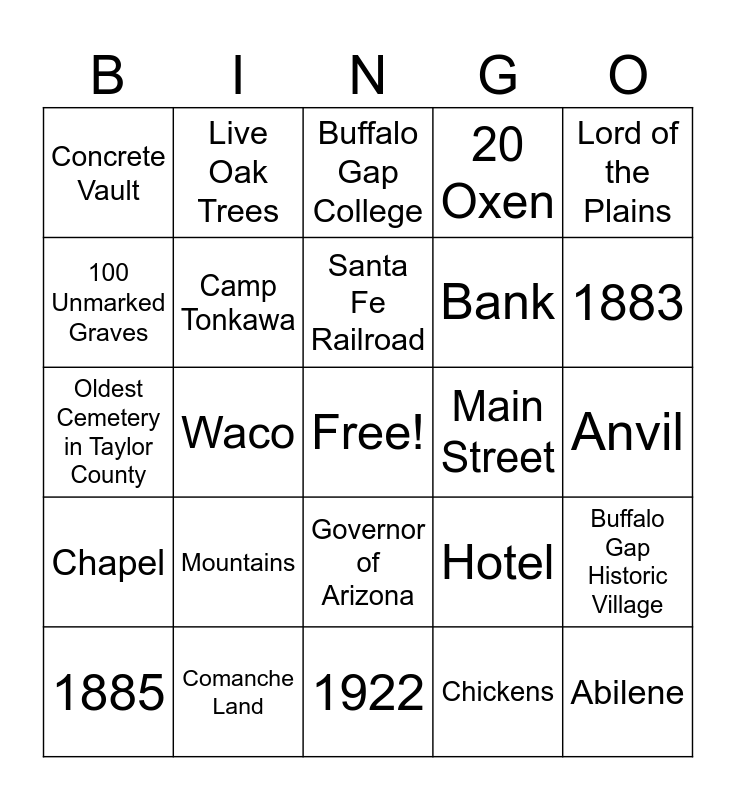 This bingo card has a free space and 37 words: Buffalo Hunters, Quiet Town, Abilene State Park, Camp Tonkawa, Buffalo Gap Historic Village, Mountains, Santa Fe Railroad, Comanches, Lord of the Plains, Hide Town, Waco, 20 Oxen, Abilene, Anvil, 100 Unmarked Graves, Chapel, Stained Glass Window, Buffalo Gap College, Governor of Arizona, Main Street, Concrete Vault, 1883, 1885, 1922, Judge John Murray, Chickens, Live Oak Trees, $15 a Month, County Seat, Presbyterian Encampment, Buffalo Migrate, Comanche Land, Oldest Cemetery in Taylor County, Stained Glass Window, Hotel, Bank and Depot.