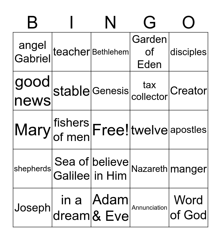 This bingo card has a free space and 24 words: Sea of Galilee, in a dream, Genesis, Joseph, disciples, angel Gabriel, good news, teacher, twelve, believe in Him, tax collector, Mary, Nazareth, manger, stable, Annunciation, apostles, Bethlehem, Creator, fishers of men, Word of God, shepherds, Garden of Eden and Adam & Eve.