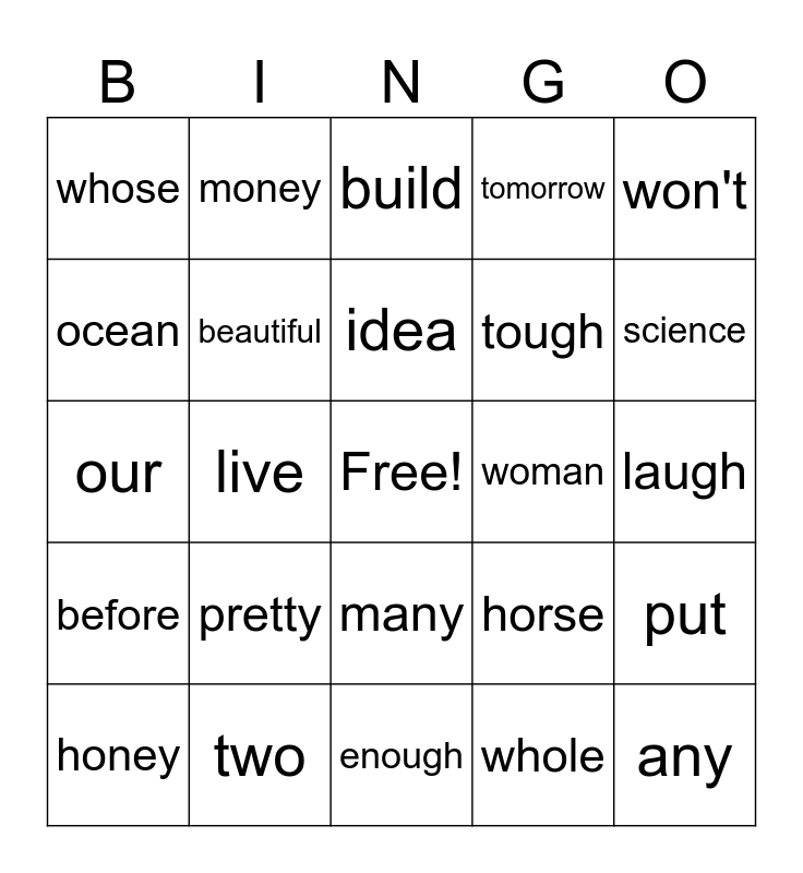 This bingo card has a free space and 27 words: horse, rough, tough, enough, ocean, build, money, before, woman, put, our, tomorrow, honey, two, science, half, beautiful, idea, pretty, whose, laugh, whole, live, any, many, won't and don't.