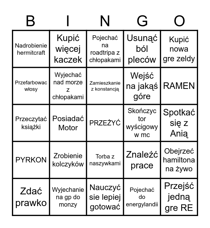 This bingo card has a free space and 24 words: Zrobienie kolczyków, Wyjechanie na gp do monzy, Zamieszkanie z konstancją, Zdać prawko, Kupić nowa gre zeldy, Nadrobienie hermitcraft, Przefarbowac włosy, Kupić więcej kaczek, Skończyc tor wyścigowy w mc, Torba z naszywkami, Wejść na jakąś góre, Przeczytać książki, Znaleźć prace, Obejrzeć hamiltona na żywo, Wyjechać nad morze z chłopakami, Pojechać do energylandii, Spotkać się z Anią, Pojechać na roadtripa z chłopakami, RAMEN, Posiadać Motor, Przejść jedną gre RE, PYRKON, Usunąć ból pleców and Nauczyć sie lepiej gotować.