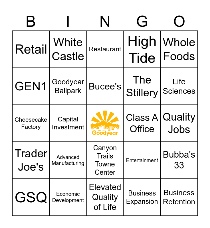 This bingo card has a free space and 29 words: GSQ, Workforce, Capital Investment, Innovation Hub, Retail, Restaurant, Goodyear Ballpark, Advanced Manufacturing, Class A Office, Economic Development, Quality Jobs, Business Retention, Elevated Quality of Life, Business Expansion, Life Sciences, Technology, Canyon Trails Towne Center, Trader Joe's, Whole Foods, Cheesecake Factory, Entertainment, Harkins, The Stillery, GEN1, High Tide, White Castle, Bubba's 33, Bucee's and Technology.