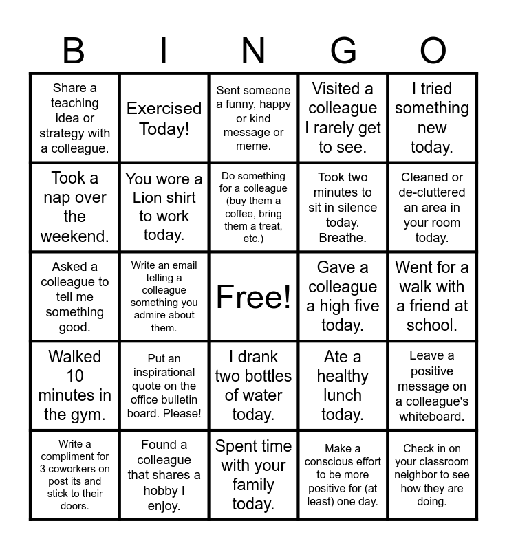 This bingo card has a free space and 24 words: Write a compliment for 3 coworkers on post its and stick to their doors., Put an inspirational quote on the office bulletin board. Please!, Do something for a colleague (buy them a coffee, bring them a treat, etc.), Make a conscious effort to be more positive for (at least) one day., I tried something new today., Share a teaching idea or strategy with a colleague., Exercised Today!, Sent someone a funny, happy or kind message or meme., Gave a colleague a high five today., Went for a walk with a friend at school., Asked a colleague to tell me something good., You wore a Lion shirt to work today., Ate a healthy lunch today., Leave a positive message on a colleague's whiteboard., Took a nap over the weekend., Found a colleague that shares a hobby I enjoy., Spent time with your family today., Visited a colleague I rarely get to see., Cleaned or de-cluttered an area in your room today., Walked 10 minutes in the gym., Write an email telling a colleague something you admire about them., I drank two bottles of water today., Took two minutes to sit in silence today. Breathe. and Check in on your classroom neighbor to see how they are doing..