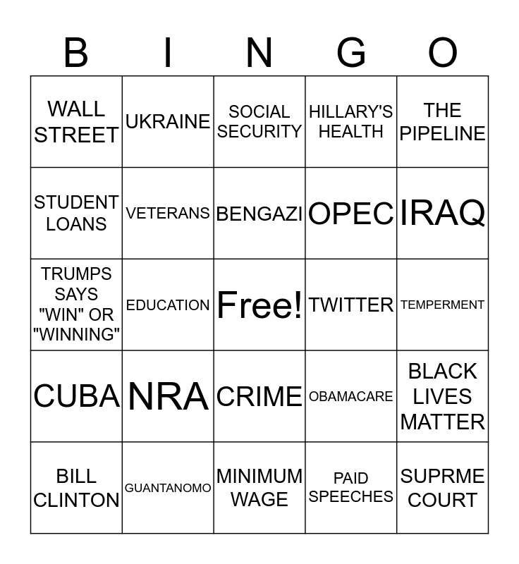This bingo card has a free space and 25 words: NRA, MINIMUM WAGE, BENGAZI, BILL CLINTON, THE PIPELINE, WALL STREET, STUDENT LOANS, UKRAINE, TWITTER, CRIME, OPEC, TRUMPS SAYS "WIN" OR "WINNING", OBAMACARE, BLACK LIVES MATTER, VETERANS, NATO, TEMPERMENT, SOCIAL SECURITY, IRAQ, EDUCATION, SUPRME COURT, GUANTANOMO, CUBA, HILLARY'S HEALTH and PAID SPEECHES.