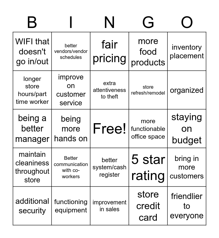 This bingo card has a free space and 25 words: Better communication with co-workers, improvement in sales, extra attentiveness to theft, additional security, inventory placement, WIFI that doesn't go in/out, longer store hours/part time worker, better vendors/vendor schedules, more functionable office space, better system/cash register, store refresh/remodel, being a better manager, 5 star rating, bring in more customers, improve on customer service, new functioning coffee maker (one that's not broken), staying on budget, fair pricing, organized, being more hands on, friendlier to everyone, functioning equipment, maintain cleaniness throughout store, more food products and store credit card.