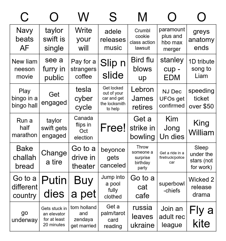 This bingo card has a free space and 49 words: superbowl -chiefs, stanley cup - EDM, russia leaves ukraine, taylor swift gets engaged, tesla cyber cycle, King William, taylor swift is single, tom holland and zendaya get married, paramount plus and hbo max merger, beyonce gets canceled, greys anatomy ends, adele releases music, NJ Dec UFOs get confirmed, Lebron James retires, Putin dies, Kim Jong Un dies, New liam neeson movie, 1D tribute song to Liam, Wicked 2 release drama, Crumbl cookie class action lawsuit, Bird flu blows up, Canada flips in Oct election, Navy beats AF, see a furry in public, go underway, Pay for a strangers coffee, speeding ticket over $50, Gets stuck in an elevator for at least 20 minutes, Get locked out of your car and get the locksmith to help, Get engaged, Watch a navy football game when they win, Get a strike in bowling, Go to a different country, Buy a pet, Run a half marathon, Throw someone a surprise birthday party, Get a ride in a firetruck/police car, Sleep under the stars (not for work), Play bingo in a bingo hall, Go to a drive in theater, Jump into a pool fully clothed, Bake challah bread, Fly a kite, Get a palm/tarot card reading, Slip n slide, Write your will, Go to a cat cafe, Change a tire and Join an adult rec league.