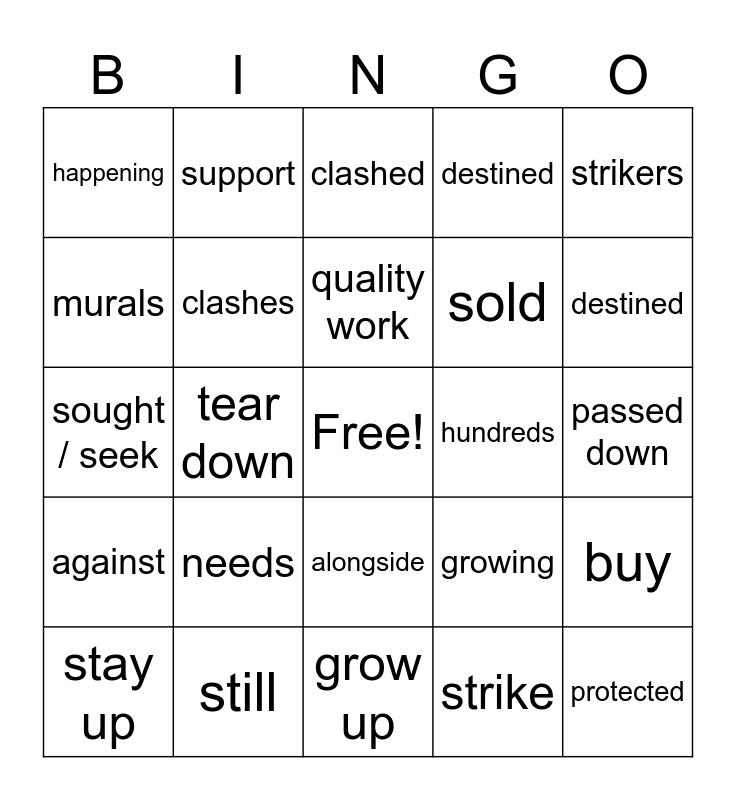 This bingo card has a free space and 34 words: challenges, strike, posters, broke, against, clashes, strikers, stay up, support, killed, quality work, clashed, noticed, foreigner, hundreds, destined, still, sought / seek, needs, growing, alongside, inherited, happening, passed down, grow up, protected, destined, bought, sold, murals, poster, tear down, buy and sell.