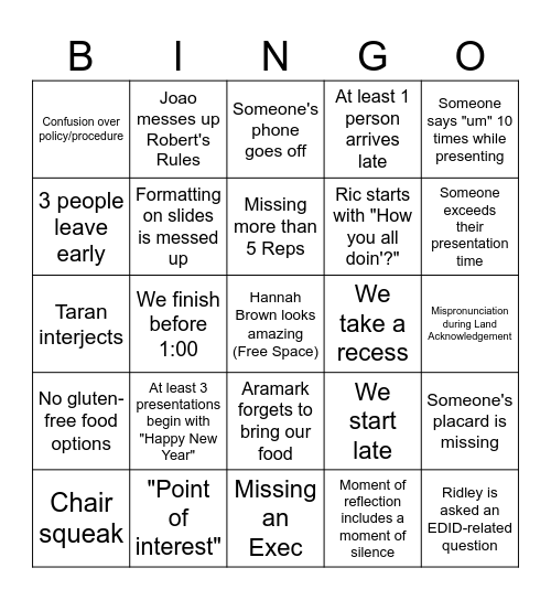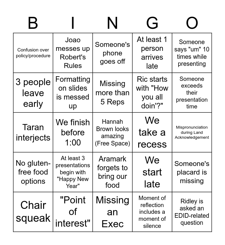 This bingo card has a free space and 27 words: We start late, Door is locked, Ric starts with "How you all doin'?", Missing an Exec, 3 people leave early, Someone's phone goes off, Joao messes up Robert's Rules, No gluten-free food options, We take a recess, Someone's placard is missing, Taran interjects, At least 1 person arrives late, Chair squeak, "Point of interest", Someone exceeds their presentation time, Jenna doesn't know something basic about King's, Formatting on slides is messed up, Missing more than 5 Reps, At least 3 presentations begin with "Happy New Year", Confusion over policy/procedure, Mispronunciation during Land Acknowledgement, Moment of reflection includes a moment of silence, We finish before 1:00, Ridley is asked an EDID-related question, Aramark forgets to bring our food, Someone says "um" 10 times while presenting and Mai or Morgan finishes a colouring page.