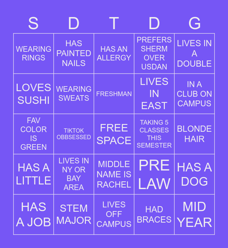 This bingo card has a free space and 24 words: LIVES IN NY OR BAY AREA, STEM MAJOR, FRESHMAN, HAS A JOB, LIVES IN A DOUBLE, WEARING RINGS, LOVES SUSHI, HAS PAINTED NAILS, TAKING 5 CLASSES THIS SEMESTER, MIDDLE NAME IS RACHEL, LIVES IN EAST, FAV COLOR IS GREEN, PRE LAW, HAS A DOG, WEARING SWEATS, HAD BRACES, BLONDE HAIR, HAS AN ALLERGY, IN A CLUB ON CAMPUS, TIKTOK OBBSESSED, MID YEAR, HAS A LITTLE, PREFERS SHERM OVER USDAN and LIVES OFF CAMPUS.