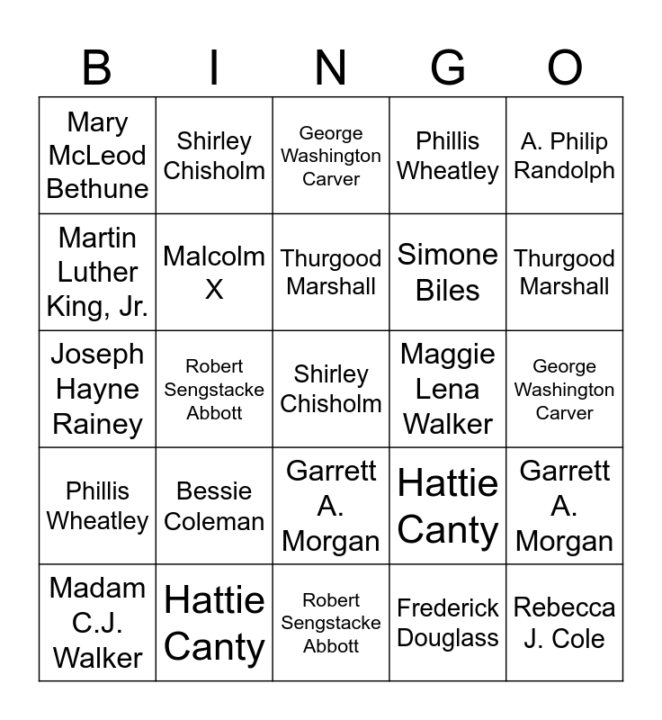 ⚠ This card has duplicate items: Shirley Chisholm (2), Jackie Robinson (2), Madam C.J. Walker (2), Mary McLeod Bethune (2), Frederick Douglass (2), George Washington Carver (2), Otis Boykin (2), A. Philip Randolph (2), Hattie Canty (2), Phillis Wheatley (2), Maggie Lena Walker (2), Garrett A. Morgan (2), Bessie Coleman (2), Muddy Waters (2), Robert Sengstacke Abbott (2), Jane Bolin (2), Joseph Hayne Rainey (2), Rebecca J. Cole (2), Thurgood Marshall (2)