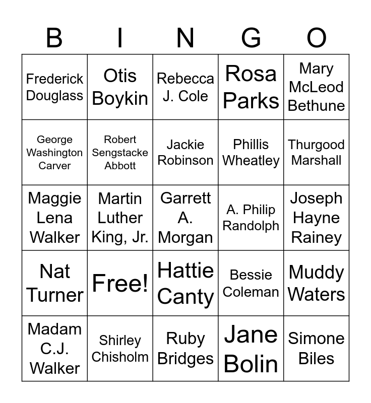 This bingo card has a free space and 24 words: Free!, Shirley Chisholm, Jackie Robinson, Madam C.J. Walker, Mary McLeod Bethune, Frederick Douglass, George Washington Carver, Otis Boykin, A. Philip Randolph, Hattie Canty, Phillis Wheatley, Maggie Lena Walker, Bessie Coleman, Muddy Waters, Robert Sengstacke Abbott, Jane Bolin, Joseph Hayne Rainey, Rebecca J. Cole, Thurgood Marshall, Martin Luther King, Jr., Simone Biles, Nat Turner, Rosa Parks and Ruby Bridges.