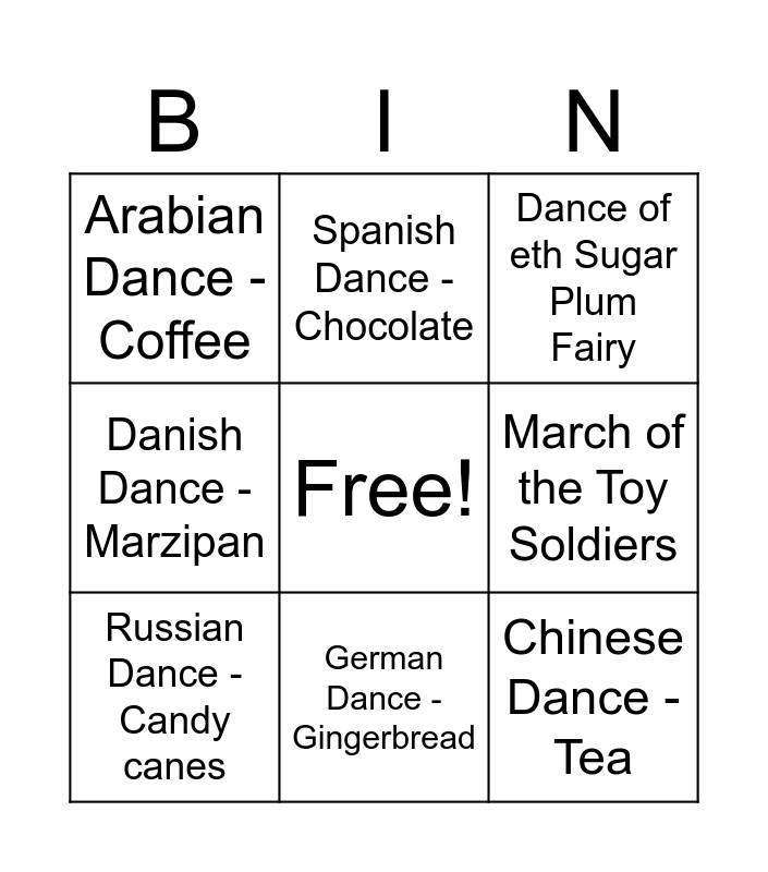 This bingo card has a free space and 8 words: March of the Toy Soldiers, Dance of eth Sugar Plum Fairy, Spanish Dance - Chocolate, Russian Dance - Candy canes, Arabian Dance - Coffee, Chinese Dance - Tea, Danish Dance - Marzipan and German Dance - Gingerbread.