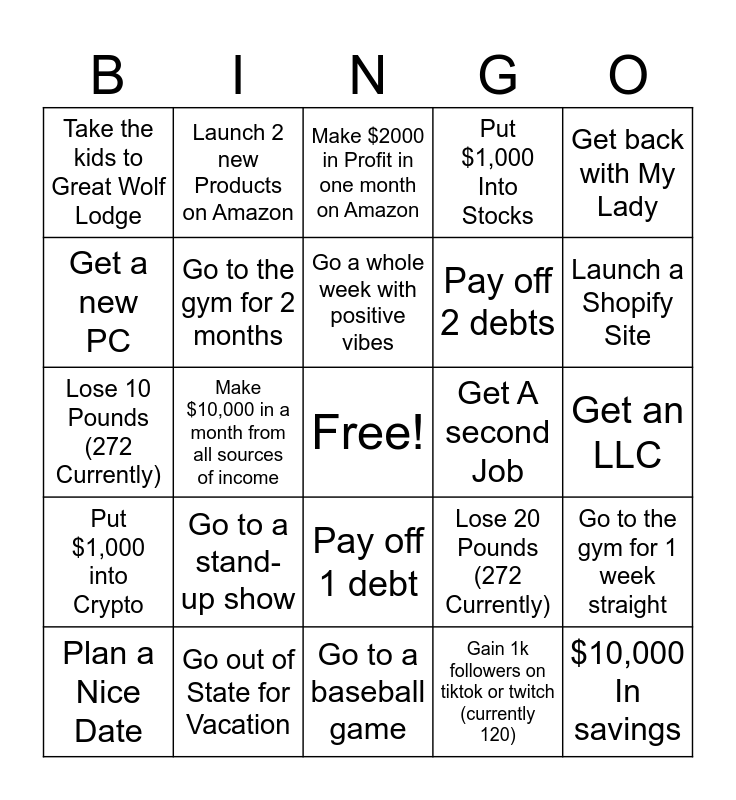 This bingo card has a free space and 25 words: Go to a stand-up show, Go to a baseball game, Go a whole week with positive vibes, Plan a Nice Date, Get back with My Lady, Take the kids to Great Wolf Lodge, Get a new PC, Launch 2 new Products on Amazon, Get A second Job, Pay off 1 debt, Pay off 2 debts, Lose 10 Pounds (272 Currently), Lose 20 Pounds (272 Currently), Go to the gym for 1 week straight, Go to the gym for 2 months, Get new glasses, Get an LLC, Make $2000 in Profit in one month on Amazon, Launch a Shopify Site, Make $10,000 in a month from all sources of income, $10,000 In savings, Go out of State for Vacation, Put $1,000 into Crypto, Put $1,000 Into Stocks and Gain 1k followers on tiktok or twitch (currently 120).